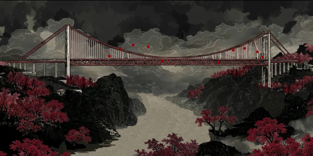 This work uses a Kinect depth camera to capture visitors' hand movements, transforming their body language into visual parameters through real-time data processing to trigger interactions within the projected imagery. Visitors' gestures become 'invisible strings,' plucking the cables of bridge structures to produce melodious sounds, g