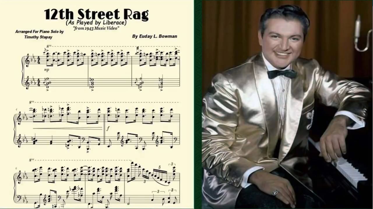 12th Street Rag arranged as performed by piano artist, Liberace. This is based on his 1943 music video. This was before his famous emmy award-winning t.v. show. Now you can learn to play this sensational song just as Liberace did!