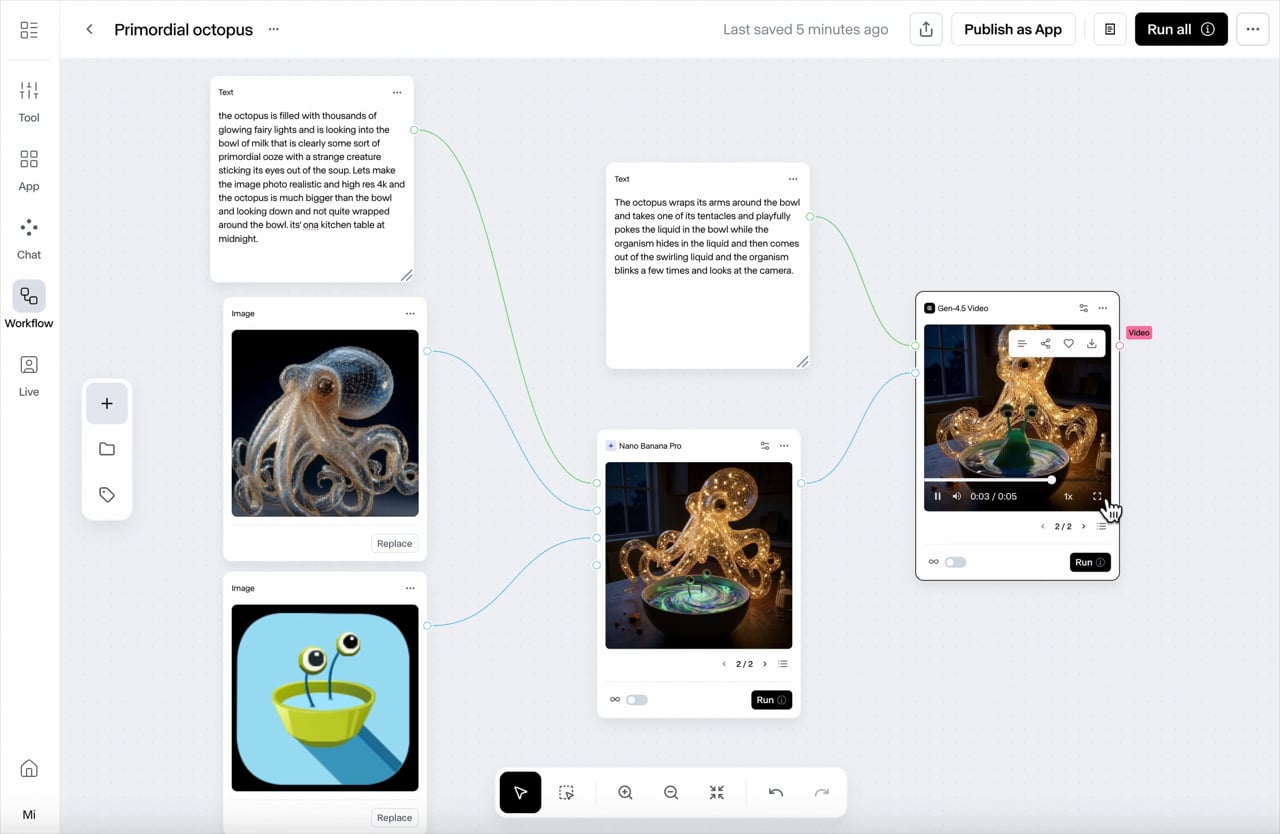 A demo with flow scripting using a no code AI video editing tool in RunwayML. We'll take two characters from two images and mash them up and then have a bit of motion added as the characters interact. In this case it's the primordial soup and the copper glass octopus from Mars.